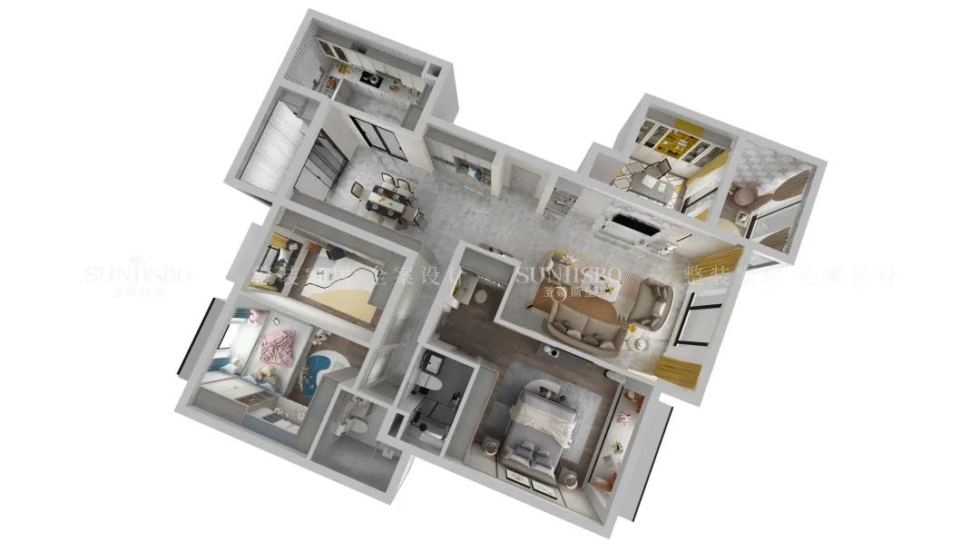 设计师通过业主需求说明,打破各个空间的区域界限,进行合理的空间调度,将美式轻奢风格与空间融合,为业主构筑一个流动、交互、有温度的生活空间。