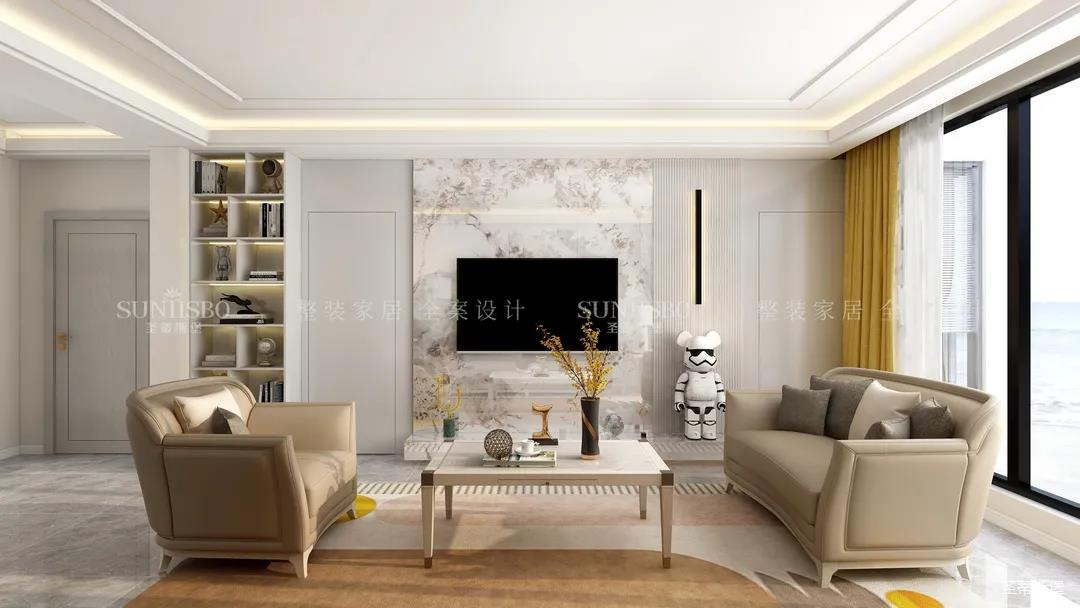 客厅设计置顶展示柜和大理石,实现了现代和轻奢风格间的均衡组合。温柔莫兰迪色调的沙发,细节的实木底座和人性化的环抱式设计让空间更添温馨的气息。